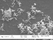 Ugyanannak az 1 μm-es sárga pigmentnek az átmenőfényes keresztezett polarizátoros képe, fekete háttérrel (kb.500-szoros nagyítással) és a pásztázó elektron-mikroszkópos (fekete-fehér) képe van itt egymás mellett. Az átmenőfényben pontszerűen megjelenő szemcsék, a pásztázó elektron mikroszkópi képen, a nagyobb nagyításnál (5000-10.000-szeres) már jól láthatóan „tűszerű” szemcsék.